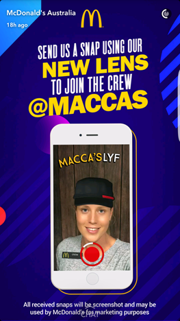 Hier ein Beispiel von McDonalds, die über Snapchat junge Verkaufsmitarbeiter suchen.