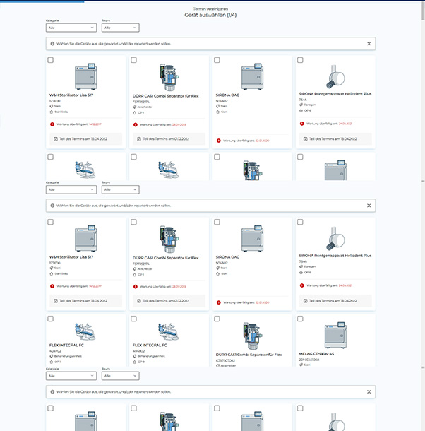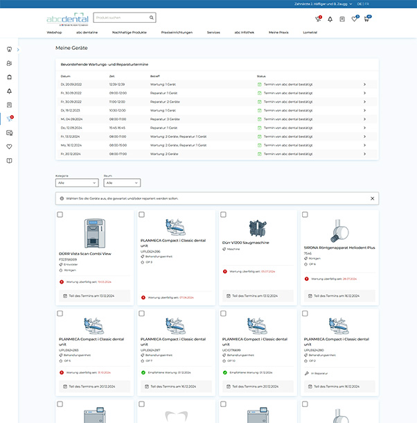 Eines der Highlights des Projektes ist die neue Übersicht für Zahnärzt:innen und deren Team. Hier zeigen wir alle Geräte der Praxis an - auch solche, die nicht bei diesem Händler gekauft wurden. So können Praxisinhaber:innen jederzeit den Überblick über ihre Ausstattung behalten. - Wartungsmanagement