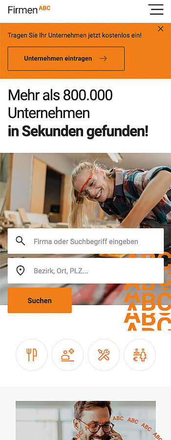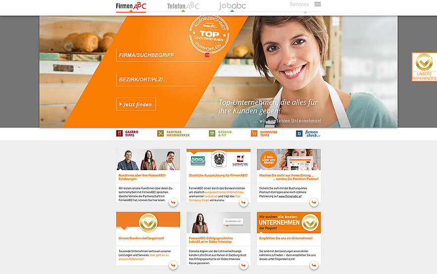 Das FirmenABC ist seit Jahrzehnten ein bekanntes Portal. Gelistet sind hunderttausende Unternehmen mit Stammdaten und weiterführenden gesellschaftsrechtlichen Informationen. Die 2005 gegründete Empfehlungsmarketingagentur unterstützt Kleinunternehmen dabei, die notwendige Sichtbarkeit im Internet zu erlangen. Das Leistungsspektrum reicht vom Eintrag in der Firmendatenbank über Filmreportagen bis zu Google- und Radiowerbekampagnen. Um das grundsätzlich gut funktionierende Portal in puncto Design und Leadgenerierung auf den neuesten Stand zu bringen, startete das staatlich ausgezeichnete Unternehmen einen Komplettrelaunch mit LIMESODA.