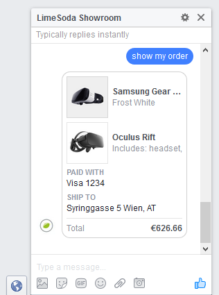 - Online Shops können List Templates verwenden, um Produkte direkt im Messenger aufzulisten. In Kombination mit dem Receipt Template und dem Buy Button kann man so kleine Teile eines Shops direkt abbilden – zumindest in den USA. Kunden können zudem den Lagerstand eines Produktes abrufen, oder den Lieferstatus ihrer Bestellungen. Der Lieferstatus kann nicht nur abgefragt werden, auf Wunsch des Users kann auch automatisch eine Aktualisierung per Messenger versendet werden. D.h. ein Bot muss nicht nur reagieren, er kann auch aktiv Nachrichten versenden. Hier ein Beispiel für eine Bestellbestätigung: