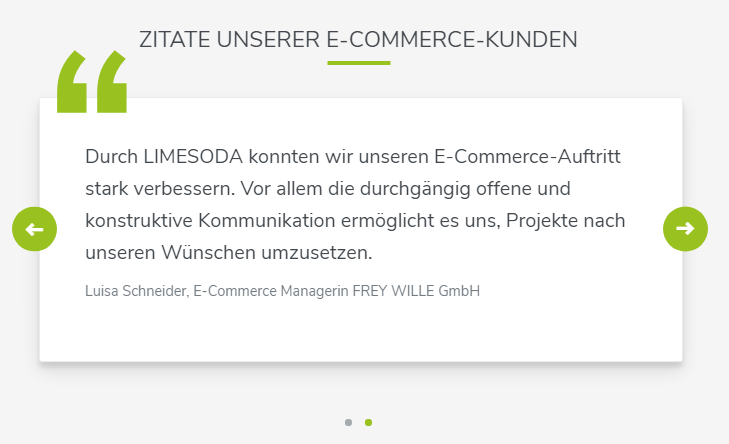 Testimonials tragen ebenfalls dazu bei, Vertrauen bei Ihren Website-Besucher:innen zu erzeugen. Dabei können beispielsweise Zitate von Kund:innen oder Expert:innen, bekannten Personen, die das Angebot ebenfalls unterstützen oder Referenzen bisheriger Projekte eingesetzt werden.