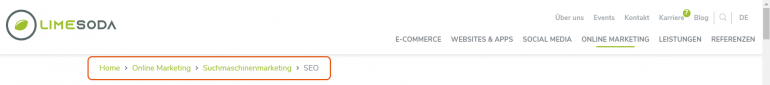 Hilfreich dafür ist die sogenannte Breadcrumb-Navigation. Diese unterstützt die User:innen beim Zurücknavigieren, da man damit den genauen Pfad in der Seitenarchitektur erkennen kann. Somit ermöglichen es Breadcrumbs, mit einem Klick zurück auf übergeordnete Seite zu gelangen. Außerdem kann diese in der SERP als Rich-Snippet angezeigt werden, wenn diese als strukturierte Daten ausgezeichnet sind.