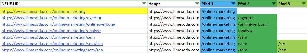 Um dabei den Überblick zu bewahren, empfiehlt es sich, Ihre Website-Struktur in einem Excel-Sheet festzuhalten. Als Beispiel hier ein Auszug aus unserer URL-Struktur des Bereichs Online Marketing:
