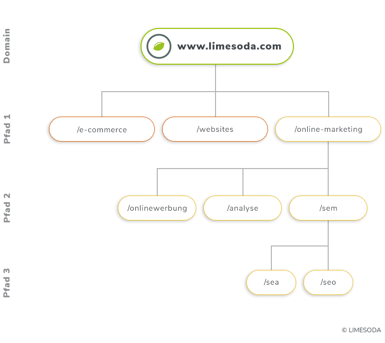 Um den idealen Aufbau einer Website-Struktur zu verdeutlichen, hier ein vereinfachtes Beispiel unserer LIMESODA-Website: