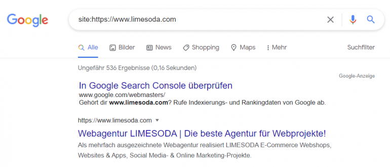 Um zu überprüfen, ob Ihre Seite in den Google-Index aufgenommen wurde, können Sie “site:” mit der URL Ihrer Seite ganz einfach in die Google-Suche eingeben. Erscheint ein Suchergebnis, ist Ihre Seite indexiert: