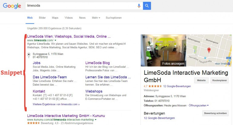 Bei der Klickrate geht es darum, wie oft meine Seite in den Suchergebnissen bei Google gezeigt und wie oft sie dann angeklickt wird. Je höher die Rate, desto besser. Maßgeblich für diesen Wert ist die Optimierung von Seitenadresse („URL“) Seitentitel („Title“) und Seitenbeschreibung („Meta Description“), aus denen Google die Vorschau der Seite im Suchergebnis erstellt. Diese Vorschau wird als Snippet bezeichnet.