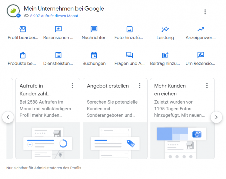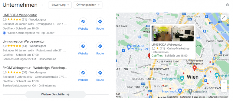 Je mehr Informationen Sie also zur Verfügung stellen, umso mehr können Besucher:innen schon direkt in den Suchergebnissen über Ihr Unternehmen erfahren, das erhöht Ihre Relevanz für die Nutzer:innen. Und je intensiver Sie sich um Ihren Eintrag kümmern, desto mehr steigt Ihre Aktivität, Aktualität und Interaktion, was Google wiederum mit mehr Sichtbarkeit durch ein Top-Ranking belohnt.