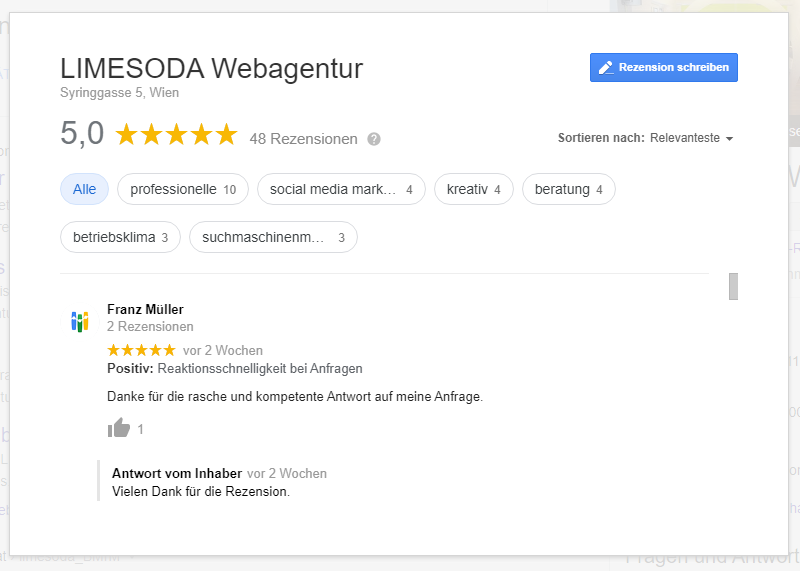 Wenn Sie nun Reviews erhalten haben, sollten Sie innerhalb von 24-48 Stunden darauf reagieren und alle Bewertungen beantworten. Und zwar nicht nur mit einem schlichten "Danke" bei positiven Reviews - schreiben Sie einen kurzen Kommentar und gehen Sie auf das Feedback ein.