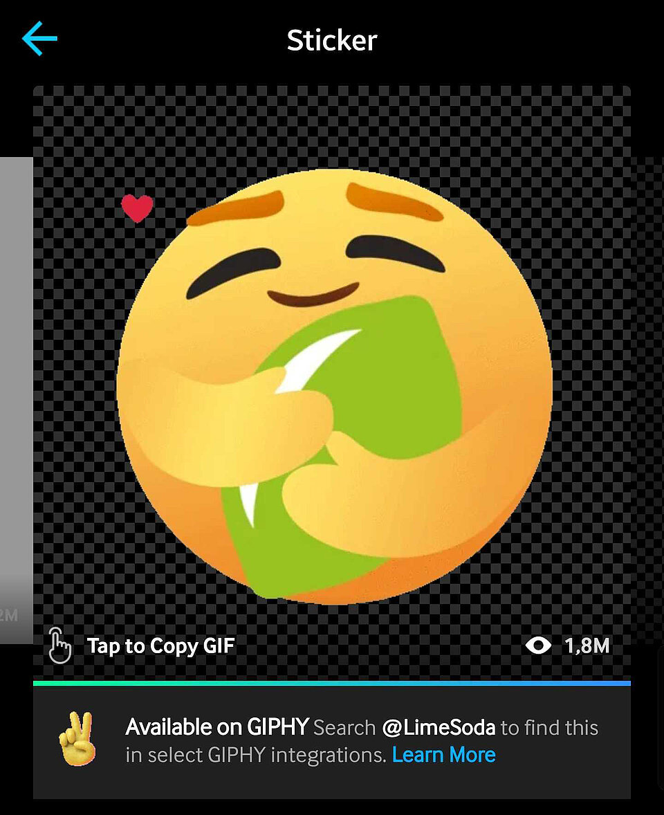 Wurde Ihr Sticker dann endlich freigeschalten, sollten Sie ihn auch über die Suche aufrufen und einsetzen können. Derzeit funktioniert die Suche viel besser, wenn man den Namen des Brand Channels inklusive @ eingibt (zum Beispiel @limesoda) und nicht mit einzelnen Stichworten sucht. Nach einiger Zeit sollten Sie den Sticker aber auch mit den angegebenen Keywords finden. Das kann allerdings ab der Freischaltung ein paar Stunden oder gar einen ganzen Tag lang dauern. Hier ist erneut Geduld gefragt.
