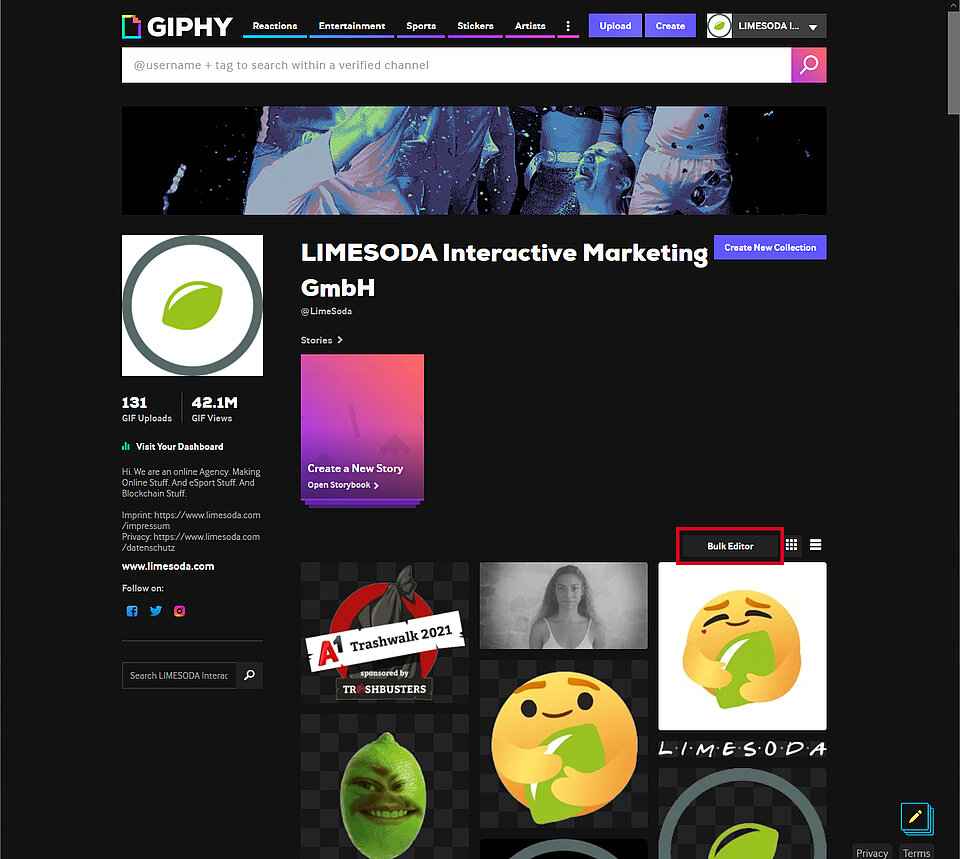 Öffnen Sie Ihren GIPHY Brand Channel und klicken Sie auf den „Bulk Editor“-Button.
