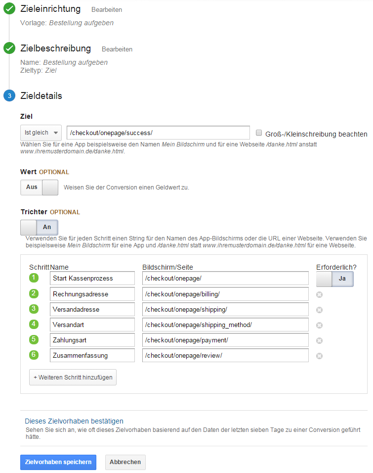 Alle weiteren URLs signalisieren Zwischenschritte auf dem Weg zu diesem Ziel. Wir aktivieren die Option Trichter. In die 1. Spalte tragen wir jeweils den Namen dieses Schrittes ein. Dieser ist frei wählbar und wird im Bericht für die Beschriftung des Trichters verwendet. Es empfehlen sich also kurze, sprechende Begriffe. In die 2. Spalte tragen wir die URLs der Schritte ein.