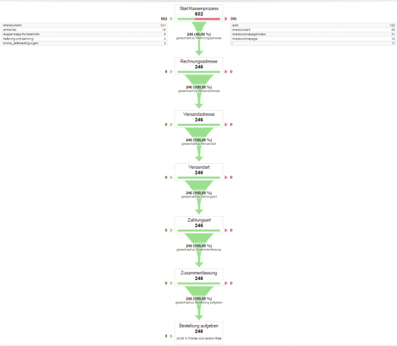 Ein anschauliches Beispiel dafür ist der Checkout-Prozess in einem Webshop. Ich orientiere mich nun am Onepage-Checkout von Magento, den dieses Shop-System standardmäßig mitliefert (und vernachlässige dabei bewusst die Tatsache, dass das Tracking der einzelnen Schritte aufgrund der Verwendung von AJAX im Checkout-Prozess etwas kniffliger ist).