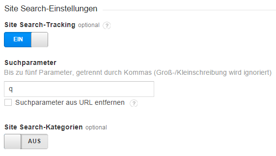 Sobald man Site Search-Tracking aktiviert, werden 3 weitere Formularfelder eingeblendet: