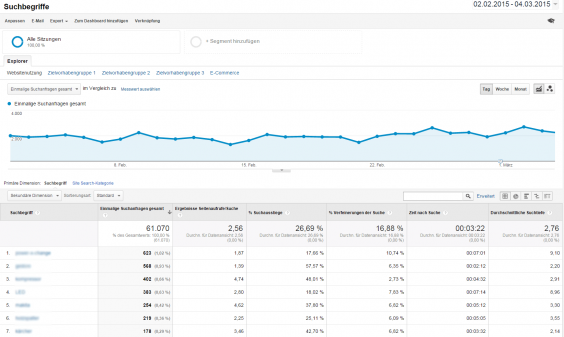 Einmal richtig konfiguriert bietet Google Analytics unter Verhalten > Sitesearch > Suchbegriffe tiefe Einblicke, wie die Besucher Ihrer Webseite mit der dort angebotenen Suche umgehen. Diese ermöglichen es Ihnen, die Bedürfnisse Ihrer Benutzer noch besser zu verstehen und die Struktur und Aufbereitung Ihres Angebots laufend dahingehend zu optimieren.