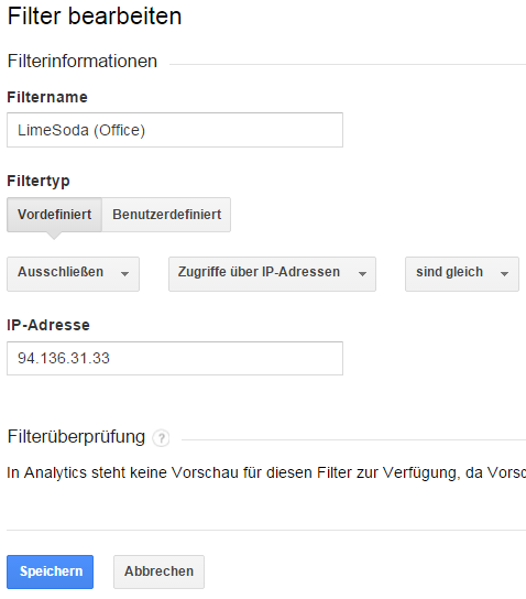 Damit Ihre Zugriffe bzw. die Ihrer betreuenden Agentur(en) sowie etwaige automatisierte Zugriffe zu Testzwecken die Kennzahlen nicht verfälschen, empfiehlt sich die Hinterlegung von Filtern. Diese schließen einen Teil des Traffics, der anhand bestimmter Parameter wie z.B. der externen IP-Adresse des Besuchers erkannt wird, komplett aus dem Tracking aus.