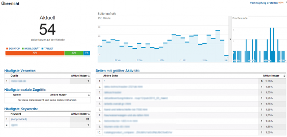Konto, Property und Webansicht(en) sind eingerichtet und konfiguriert, der Code in jede einzelne Seite Ihres Webauftritts eingefügt. Nun müssen wir auf Nummer sicher gehen, dass Google Analytics auch wirklich das tut, was es tun soll – die Zugriffe aufzeichnen. Um die Latenzzeit, die es bei den normalen Berichten gibt, nicht abwarten zu müssen, empfiehlt sich ein Blick in den Menüpunkt Echtzeit. Hier bekommen Sie Aktivitäten, die auf Ihrer Seite stattfinden, wie der Name vermuten lässt (beinahe) live mit.