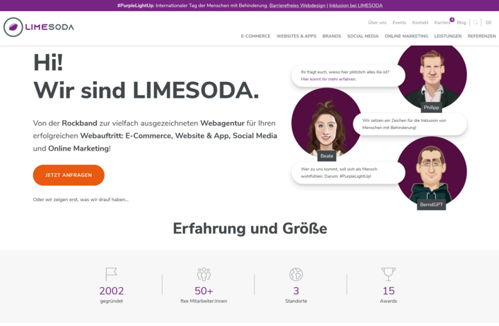 Inklusion bedeutet Chancengerechtigkeit für alle, in allen Lebensbereichen. Sie gehört zu den Werten, die wir leben wollen. Darauf baut auch der Arbeitsalltag bei LIMESODA auf. Inklusion bedeutet auch den Abbau von Hindernissen. Soweit möglich, sind wir an unseren Standorten barrierefrei zu erreichen. Digital stehen wir unseren Kund:innen mit Rat und Tat zur Verfügung, wenn es um den Abbau von Hindernissen im Internet geht. Bei der Erstellung von Websites stellt Barrierefreiheit ein wichtiges Kriterium dar, wobei wir uns nach internationalen Standards wie den WCAG (Web Content Accessibility Guidelines) orientieren. Unsere Website ist nach WACA Silber für Barrierefreiheit zertifiziert. Es ist unser Ziel, dass LIMESODA sowohl im Angebot als auch in der eigenen Identität den aktuellen Standards entspricht. Inklusion ist „Work in Progress“, lässt sich im Grunde aber auch sehr einfach zusammenfassen: Wer zu LIMESODA kommt – sei es als Kund:in oder Mitarbeiter:in –, soll sich als Mensch wohlfühlen. Diese Art der Wertschätzung spiegelt sich im Umgang miteinander ebenso wider wie in unserer Arbeit. Wir erfüllen die Einstellquote für Menschen mit Behinderung.