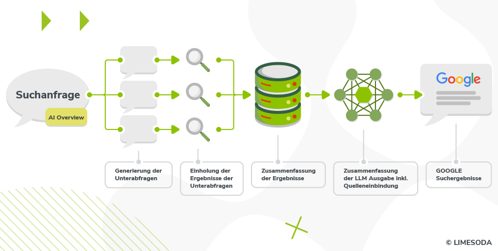 Nachdem der Nutzer einen bestimmten Prompt eingibt wird dieser auf mehrere Unterabfragen aufgeteilt (Query Fan Out), damit die Anfrage ganzheitlich beantwortet werden kann. Somit können auch Inhalte in die Antwort aufgenommen werden, die für die ursprüngliche Anfrage nicht gerankt werden.
