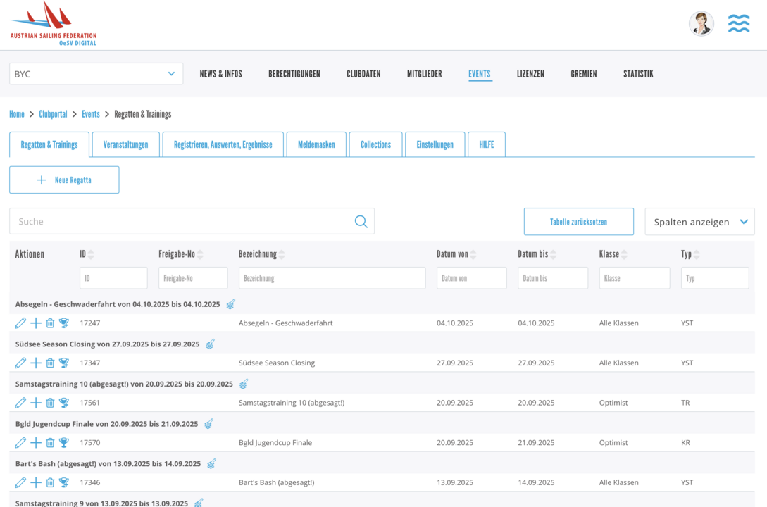 Auch Klassenvereinigungen haben nun Zugang zum Verwaltungsportal. Sie können Veranstaltungen anlegen, editieren und wie Clubs auf ihrer Website ausgeben. Die Durchführung der Veranstaltungen erfolgt durch die Clubs.