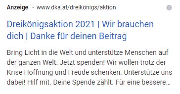 Mit den Suchanzeigen und aufmerksamkeitsstarken Display-Anzeigen machten wir Österreicherinnen und Österreichern in jedem Winkel von Österreich bis Südtirol auf die Dreikönigsaktion aufmerksam. Im Zeitraum von Dezember bis Ende Februar liefen die Kampagnen zum virtuellen Besuch und der Spendenaktion.